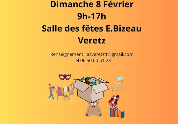 L’A.S. Véretz Tennis de Table organise un vide-grenier le dimanche 8 février, de 9h à 17h, à la salle des fêtes Eugène-Bizeau à Véretz.