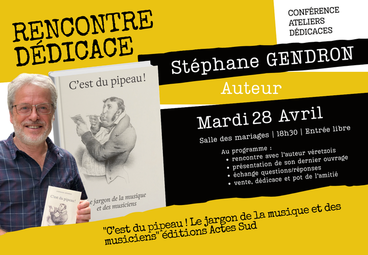 La bibliothèque municipale de Véretz accueille Stéphane Gendron, auteur véretzois, pour une soirée de rencontre et dédicace autour de son dernier ouvrage "C'est du pipeau ! Le jargon de la musique et des musiciens" (éditions Actes Sud).