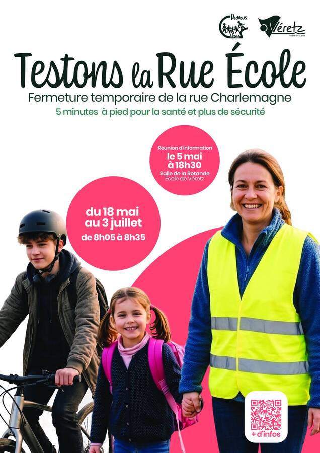 Pour donner suite à la réflexion engagée depuis 2024, avec les associations et les habitants, ainsi qu'aux recommandations du Cerema, sur le Plan des Mobilités Durables, la Mairie de Véretz relance le pédibus en même temps que l'expérimentation d'une "Rue Ecole", rue Charlemagne.
