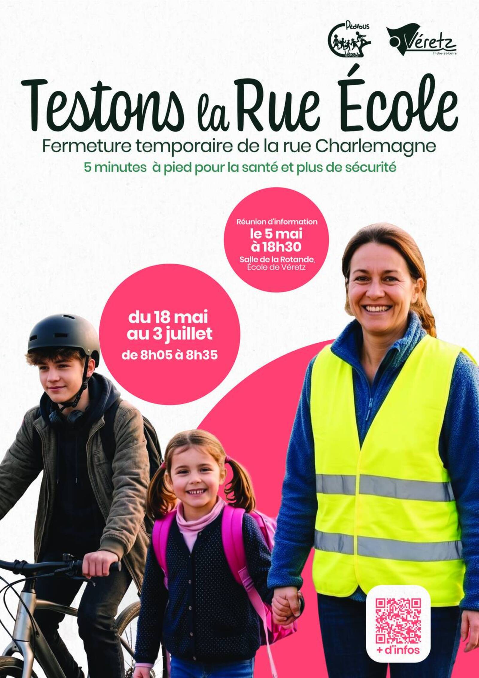 Pour donner suite à la réflexion engagée depuis 2024, avec les associations et les habitants, ainsi qu'aux recommandations du Cerema, sur le Plan des Mobilités Durables, la Mairie de Véretz relance le pédibus en même temps que l'expérimentation d'une "Rue-Ecole", rue Charlemagne.